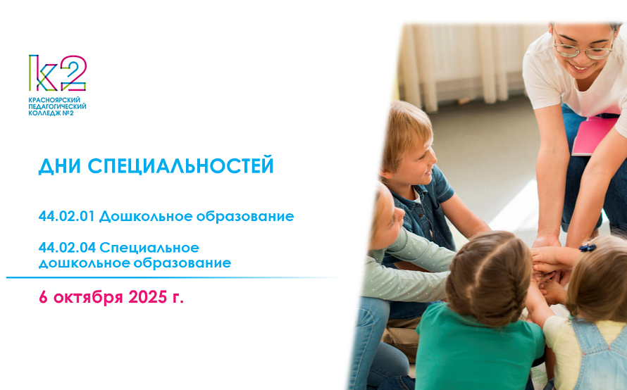 В октябре 2025 г. в нашем Колледже состоится цикл мероприятий, посвященный специальностям 44.02.01 Дошкольное образование и 44.02.04 Специальное дошкольное образование, по образовательным программам которых готовят воспитателей детей дошкольного возраста. Дни специальностей приурочены к профессиональному празднику День воспитателя и всех дошкольных работников в России. В рамках Дней специальностей будут проводиться мероприятия, на которых студентам первого курса представят актуальные практики современного дошкольного образования и специального дошкольного образования и возможности карьерного роста в профессии. В проведении мероприятий примут участие преподаватели цикловых комиссий и студенты 2,3 курсов.Разговоры о важном 6 октября пройдут особым образом: кураторы всех курсов специальностей 44.02.01 Дошкольное образование и 44.02.04 Специальное дошкольное образование расскажут факты из истории специальностей, о перспективах карьерного роста в профессии, о чемпионах Всероссийского чемпионатного движения по профессиональному мастерству «Профессионалы» по компетенции Дошкольное воспитание, о победительнице регионального этапа Всероссийского профессионального конкурса «Воспитатель года России» в 2025 году.