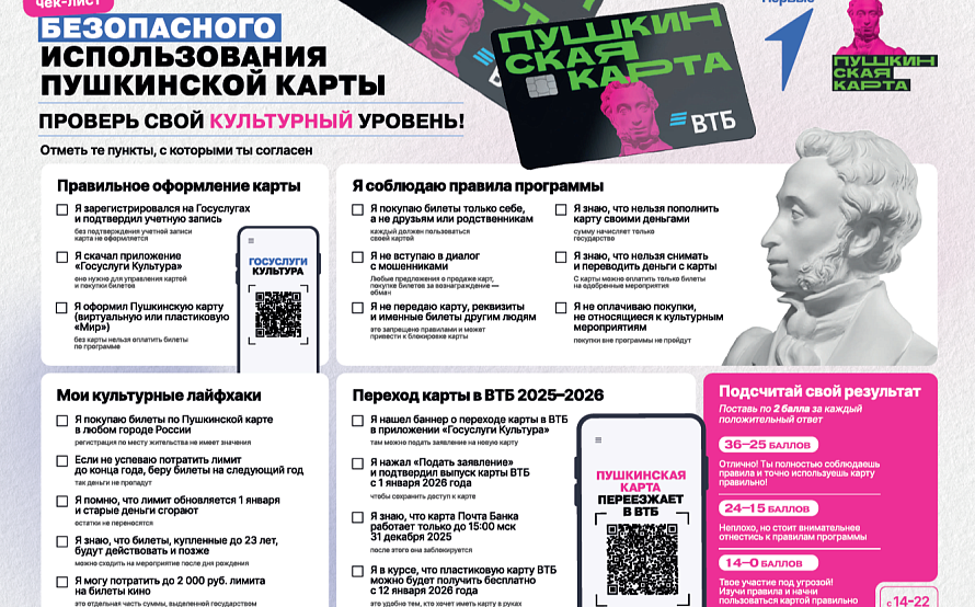 С 1 января 2026 года роль оператора программы «Пушкинская карта» переходит к Банку ВТБ (ПАО). Данное решение связано с предстоящим в 2026 году прекращением деятельности АО «Почта Банк» ввиду присоединения к Банку ВТБ (ПАО). В целях обеспечения бесшовного перехода к новому оператору возникла необходимость перевыпуска «Пушкинской карты» в Банке ВТБ (ПАО).